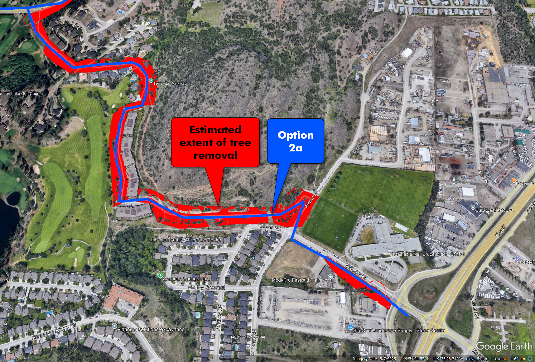 Option 2A impacts the area between Shannon Lake Rd. and CNB school.